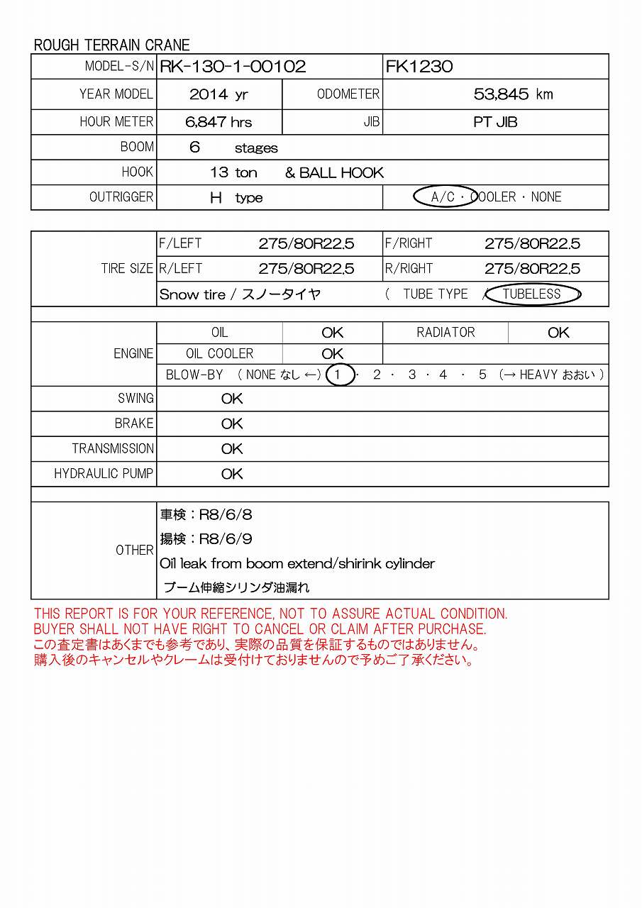53,845km, H-O/R, PT JIB, 13t & BALL, 275/80R22.5, SNOW TIRE, AC, OEM of TADANO GR-130N-1, 車検:R8/6/8, 揚検:R8/6/9