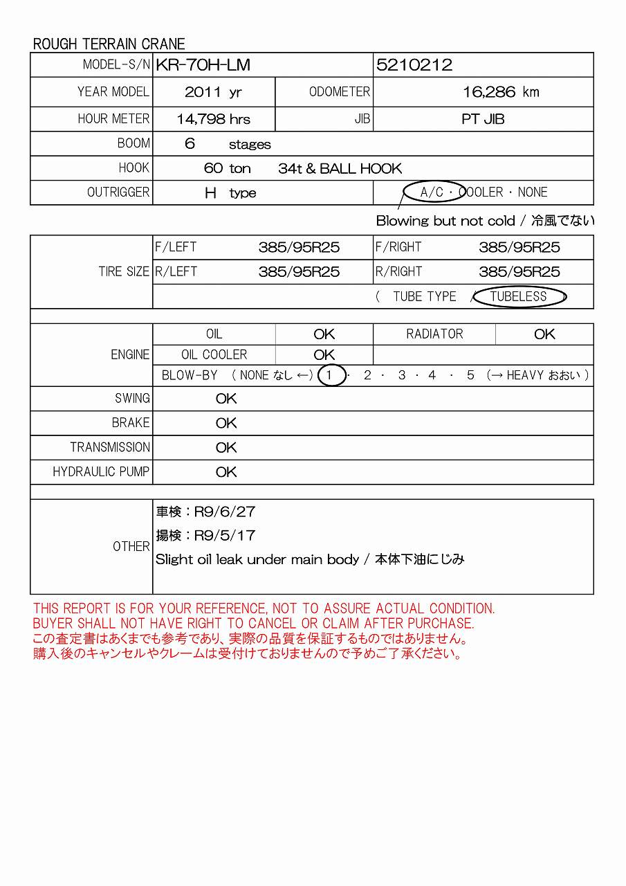 16,286km, H-O/R, PT JIB, 6 STAGES BOOM, 60t & BALL, 385/95R25, AC, 車検:R9/6/27, 揚検:R9/5/17