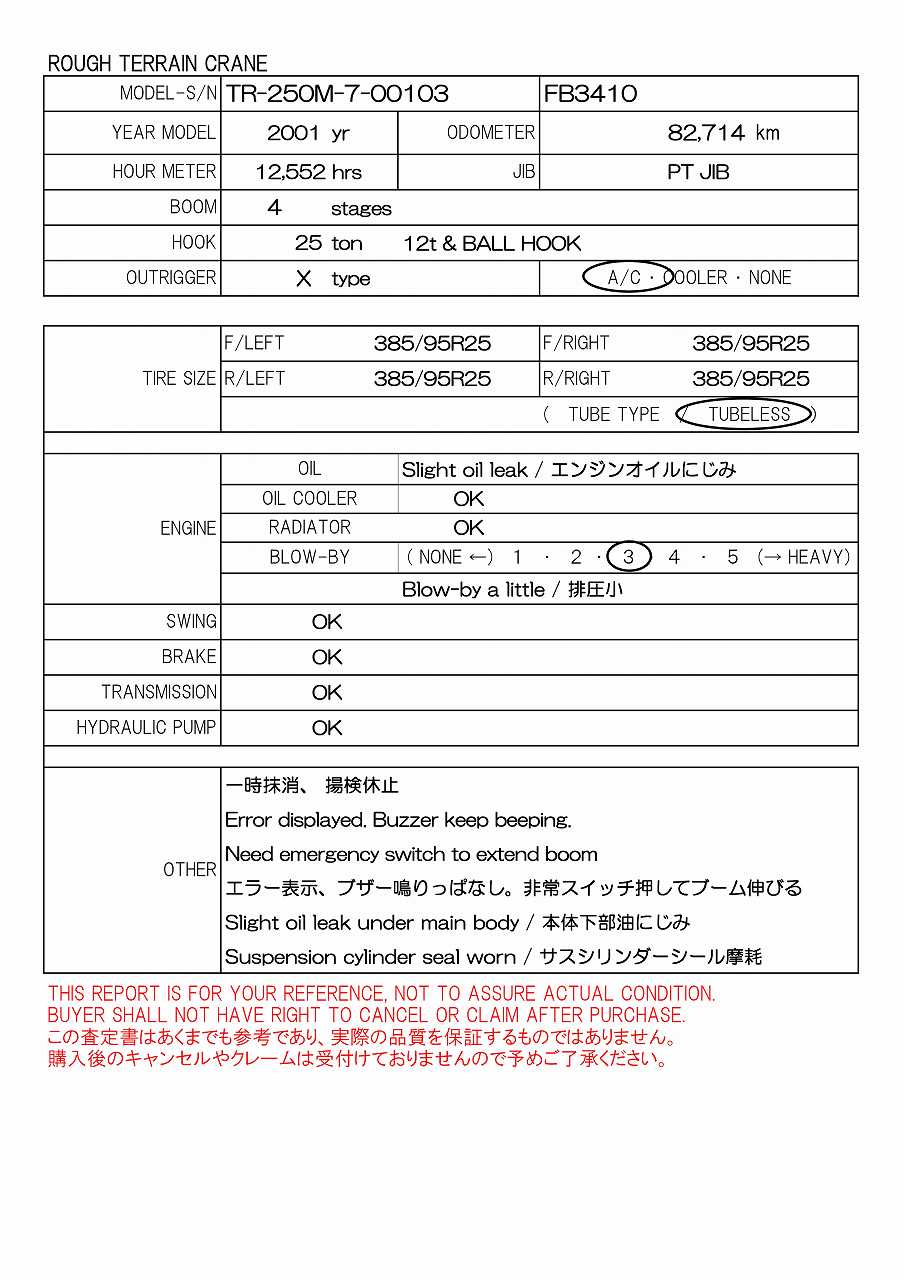 82,714km, X-O/R, PT JIB, 25t/12t/BALL HOOK, 385/95R25, AC, 一時抹消, 揚検休止中
